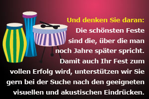 Wie man sich darstellt, so wird man gesehen. Wer sein Publikum begeistern will, muss beeindrucken bannen verführen. Ob Produktpräsentationen, Shows oder Großveranstaltungen es sind die sinnlichen Eindrücke, die Atmosphäre, die bewegen und bleibende Eindrücke hinterlassen. Eine erfolgreiche Veranstaltung ist deshalb immer mehr als nur ein technisch reibungsloser Ablauf. Mit moderner Veranstaltungstechnik versuchen Wir jeden Ort in eine faszinierende Licht- und Klangwelt zu verwandeln.